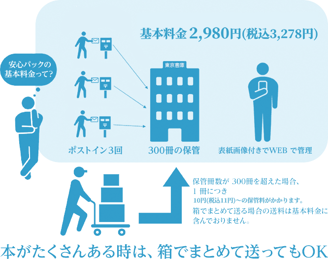- ※箱での配送はゆうパックを利用いたします。追加で書籍のお預けをする場合は1,200円(全国一律)の送料が発生いたします。